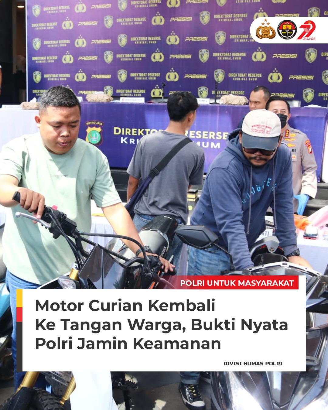 Komitmen tersebut dibuktikan dengan pengembalian kembali motor curian oleh Polda Metro Jaya kepada masyarakat usai menangkap para pelaku. Penyerahan dilakukan secara langsung kepada korban pencurian dengan membawa bukti kepemilikan kendaraan.